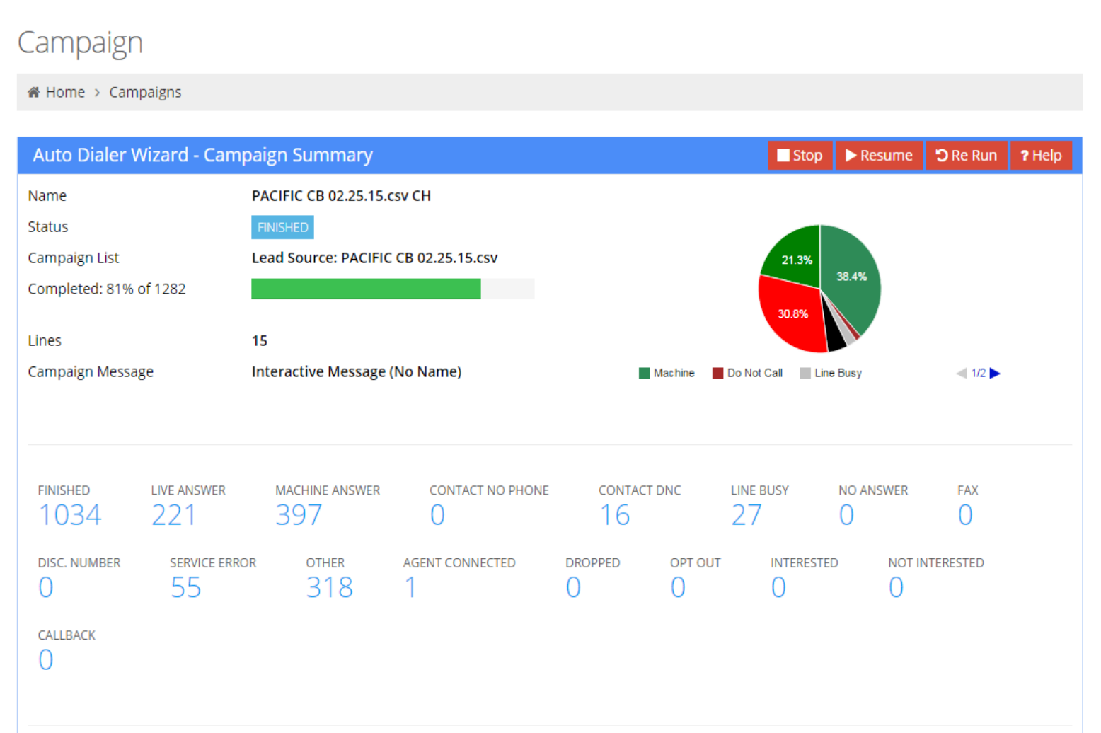 Easy campaign start and stop, pause, restart, and rerun with a single button click.