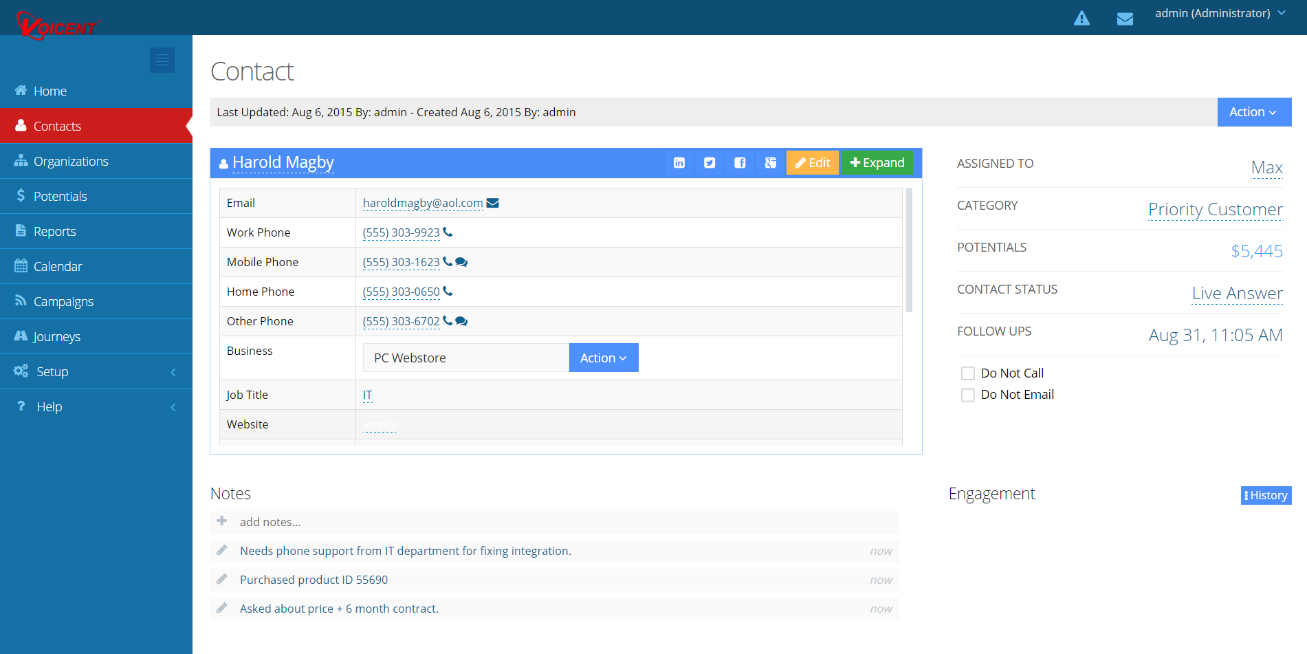 The Agent Dashboard™ provides an easy-to-use interface for Voicent's CRM software. It also seamlessly connects your CRM with your Voicent Dialer software, so that you can have a truly built-in CRM for marketing and sales software.