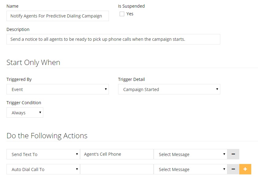 Easily create and add triggers to bolster your organization's efficiency and productivity. For example, when starting a predictive dialing campaign, you can send an alert out to all agents to make sure they are ready to pick up live calls. Triggers can also be set to act on web forms for the client, and send them a welcome email while notifying an agent to call the client.