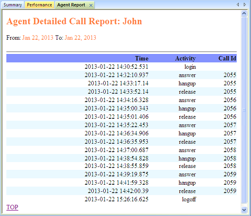 To display a detailed report of agent activies, simply click on the agent name. All agent activities are detailed to the second. "Release" activity indicates when an agent closed a call window and became available for new calls.