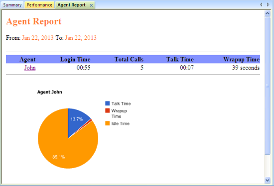 Voicent's Call Center Manager offers Agent Reports showing statistics on agents over a given time period.