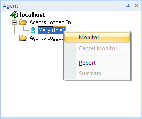 Voicent's Call Center Manager allows a manager or a supervisor to monitor agent conversations. To monitor an agent, right-click the agent in the Agent Control Window, then select Monitor.