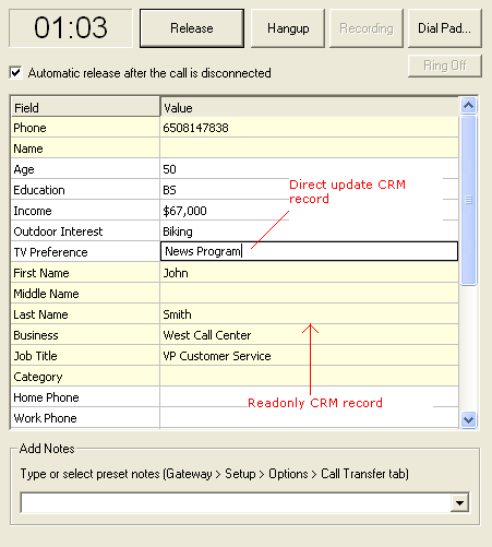 Simply choose the read access and write permission for the role. Once set, the agent screen popup window will only display CRM fields that are readable. From the same popup screen, an agent can also update CRM fields if he or she has the write permission.