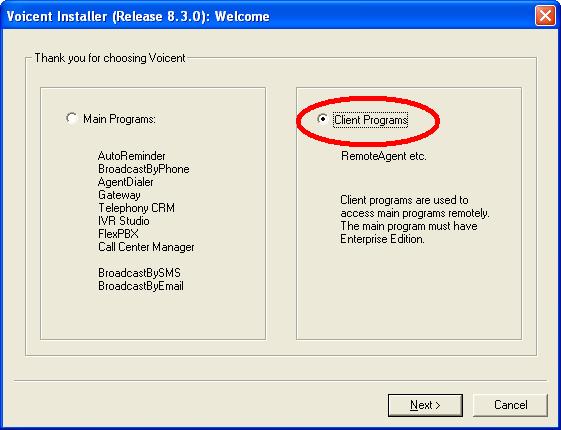 To install Voicent Call Center Manager software on a manager's computer, download Voicent software installer, run it, choose Client Program.