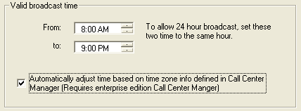 To adjust for time zone information, simply choose "automatically adjust time zone info" in campaign options. (For BroadcastByPhone, it is under Broadcast Options. For AgentDialer, it is under Prediction Dialing Options.) Once set, the software will take care of it automatically.