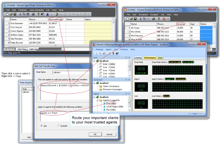 Voicent's Call Center Rules Engine offers a level of fine control and sophistication once reserved for the largest call centers, yet maintains Voicent's hallmark simplicity and ease-of-use.