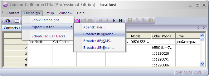 From customer record list or any search result you can easily create outbound campaigns for Voicent BroadcastByPhone, BroadcastBySMS, BroadcastByEmail, and AgentDialer. For example, to create an auto dialer campaign for BroadcastByPhone, simply select "Campaign" from the program main menu, choose "Export List For" and then choose the target Voicent tool.