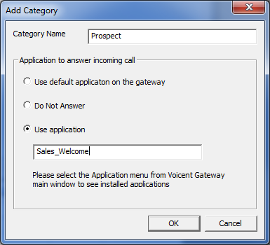 Optionally, you can select an IVR application to answer an incoming call made by a customer that belongs to this category. The ability to set different IVR application for different customers is a unique feature offered by Voicent's integrated software solution. When a caller belongs to a certain categoy calls in, the system already knows who he is, and thus can directly transfer the call to certain agents. Otherwise, the IVR system, for example, has to prompt the user to select whether he is an existing customer or not before transferring the call to an agent.