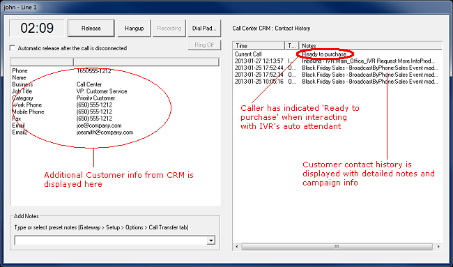 The left window displays the current caller's information that is available in the CRM database. The right window displays the current caller's contact history.