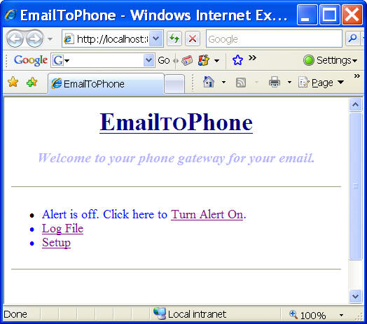 Overview | Email To Phone Sample | Gateway Tutorial Download, Install, and Configure EmailToPhone Begin Test EmailToPhone EmailToPhone Code Review The following is the main page for EmailToPhone application.