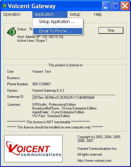 Click Voicent Gateway icon to open it, select Application > Setup ApplicationÂ… from the program main menu. Click the Install button, click the Browse button, the find the folder that EmailToPhone is extracted, choose the conf folder, then select the email.conf file, click OK.