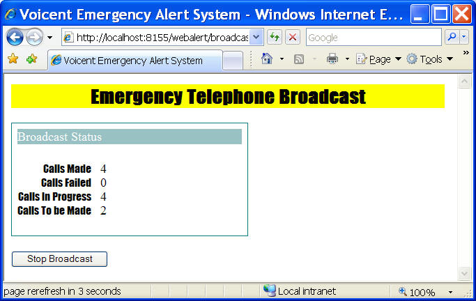 This page shows the current call status. For every 10 seconds, it will refresh the page and display the latest status. You could also stop the broadcast by clicking the Stop Broadcast button.
