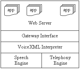 The functionality of each component and their interactions are complicated, but the complexity is hidden from applications. To have an interactive telephony application, all you have to do is provide a set of VoiceXML files, possibly dynamically generated, to Voicent Gateway. The gateway takes care of the rest. The following figure illustrates the main components involved.