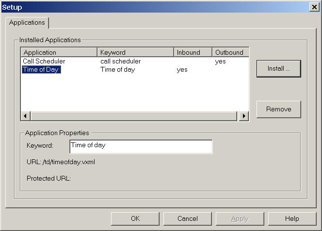 Invoke the Application Setup dialog from the Application main menu. You should see the default Call Scheduler is installed already. Click the Install button and then select your timeofday.conf file. Once installed, you should see the following. Click OK and the gateway will restart automatically.