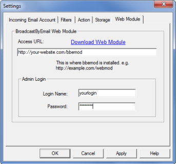After you have installed the web module on your website, you'll need to tell BroadcastByEmail where it is and give it the login info so that it can access it. Do that by selecting Settings > Web Module from the main menu (as shown below).