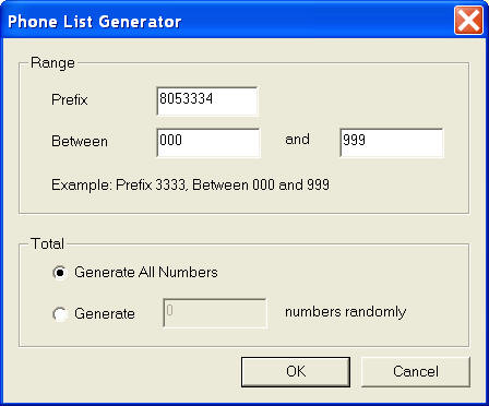 The generated list is based on the prefix and range specified in the dialog window. For example, if you want to generate all number in the format of (805)333-4****, you can specify "8053334" as prefix, and "000" and "999" as the range. The program will generate a call list as:
