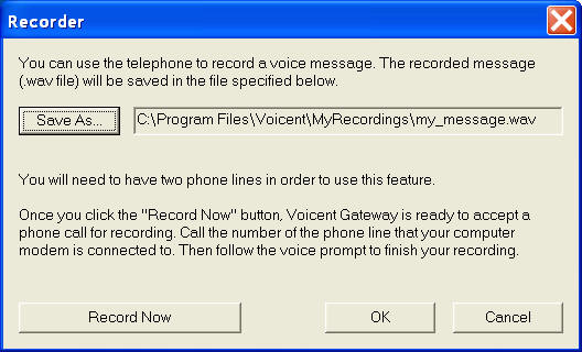 In the Recorder Dialog window, select Save As... button to get the Save As dialog window. In the Save As dialog window, enter my_message.wav as File Name, then click the Save button. Your audio file is normally saved in this folder: C:\Program Files\Voicent\MyRecordings.