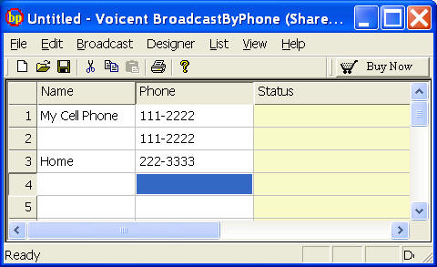 You can create a call list by simply typing in the phone numbers in the BroadcastByPhone spreadsheet window. Just click on the first row of the Phone column and start entering your phone number.