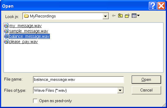 Click the Browse button. From the pop up window, select the audio file you recorded as balance_message.wav.