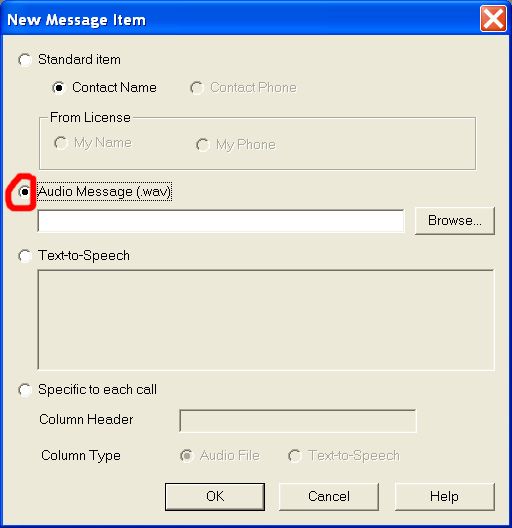 Next click on the New button inside the Message Items box. From the New Message Item dialog window, select the Audio Message (.wav) radio button.