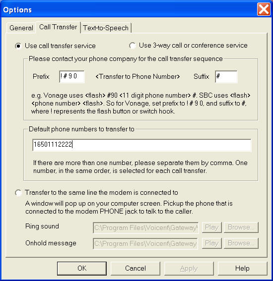 Select Setup > Options... from Voicent Gateway main menu. Click on the Call Transfer tab.