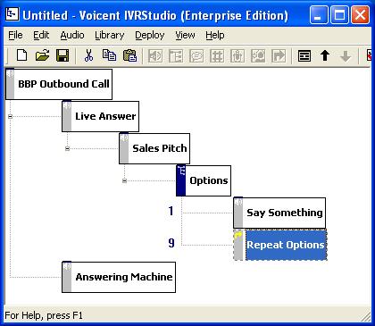 When using IVR Studio to design the application, create a prompt element for the first audio file that is the sales pitch, create a choice element for the touch tone response, and set the prompt to the options message. Add a goto element as a child of the choice element and the goto target as the choice element. This should accomplist what you want.