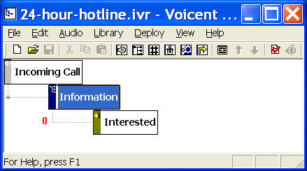 The call flow consists of one Choice Element and one Call Transfer Elements. The choice element (Information) provides the information. The Call transfer element have the call transferred. The transferred phone number can be any phone number, such as a cell phone or office receptionist's phone. It can be "transferred" using the same phone line with an alert window pop up on a computer.