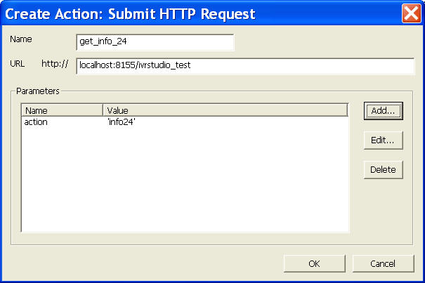 The HTTP action is basically an HTTP POST request sent to the specified URL. In this example, the URL is localhost:8155/ivrstudio_test, and one parameter action (with value equals to 'info24').