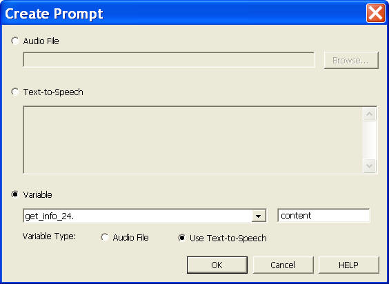 Select the Prompt tab from the element property sheet, click the New button. The dialog window is shown above. You can select action variable get_info_24, and set the parameter as content, and choose Use text-to-speech.
