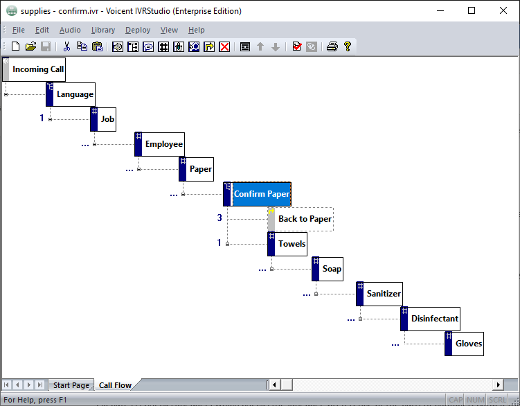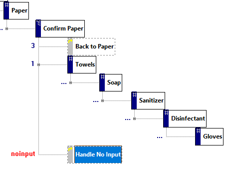 Here we inserted a Confirm Paper node under the Paper Node. Once added, cut the Towels node and paste it under the Confirm Paper node. Make sure to set the correct condition to go to each child node (press 1 or press 3). Add a Go To node Back to Paper if the caller needs to change.