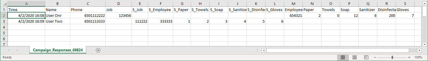 Employee calls in from a store. The app captures the job number (6 digits) of the store. After the caller enters the job number, the app collects the number of cases of various items, such as toilet paper, towels, hand soap, hand sanitizer, disinfectant, and gloves.