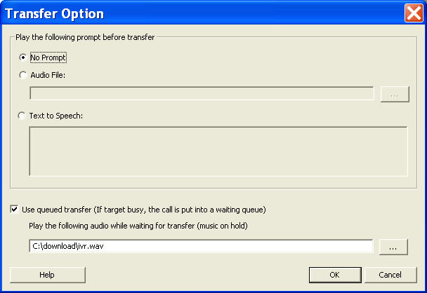 To play music on hold during queued call transfer, or any other audio message, define an audio file in the box for music on hold shown below. The on hold music only plays when a call is in a waiting queue. If the target is not busy and a call is transferred immediately, the music is not played; if the target becomes available before the music is fully played, the music will be interrupted; if the target is still busy after the music is played, it will be played until the call is answered.