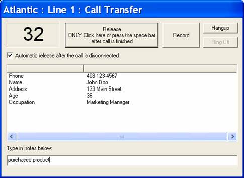 Once you see this popup screen, the phone call is connected to the computer and is ready for conversation. If you selected “Automatic release after the call is disconnected”, this dialog window will automatically close when either party hangs up the phone.