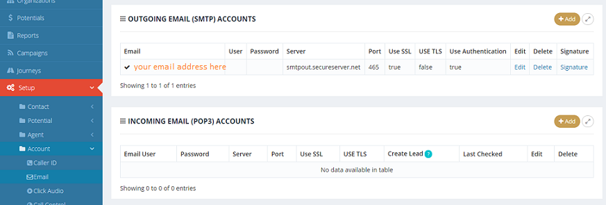 To set up your email account, select Setup, Account, Email from the main menu. The following is an example if you use Godaddy email service.