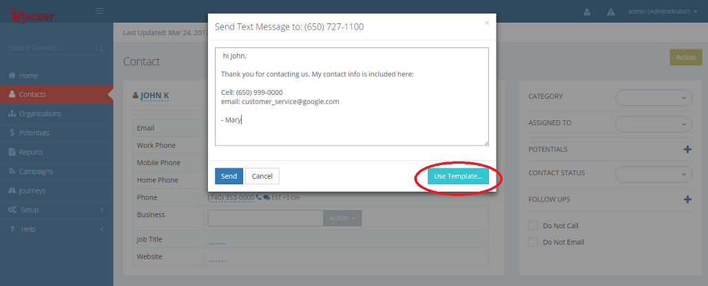 To send a message manually, simply click the text message icon on the right of a cell phone number. You can then choose a message template from button, the actual text message will automatically replace template values like ${First Name} to actual value John. You can design a message template under the setup menu.