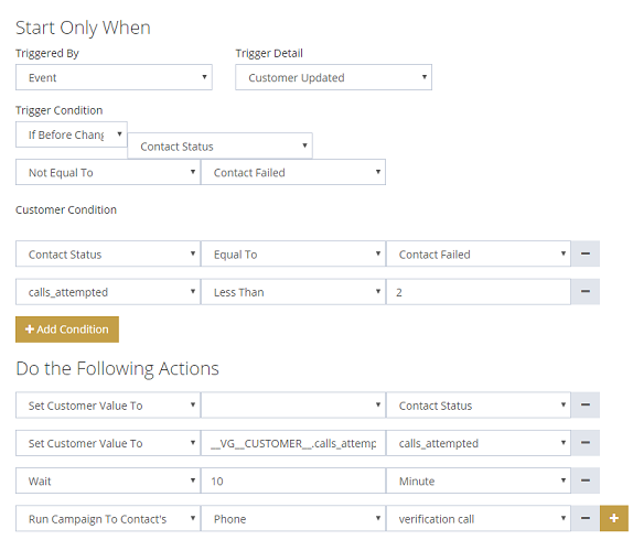 In the Do the following actions section, a set of actions are defined to run if the triggering condition is met. First, it clears the Contact Status field. Then it increment the calls_attempted value. The whole value is defined to be __VG__CUSTOMER__.calls_attempted + 1. After that, it will wait for 10 minutes and make a call to the contact's phone using the defined campaign template.