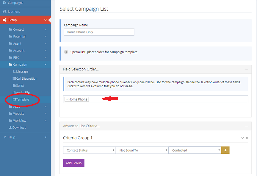 This can be set up under Setup, Campaign, Template page. Set the campaign as usual, make sure to select the correct phone field, set the correct advanced list criteria, select the campaign message and call disposition rule defined in the previous steps. We will name the campaign template Home Phone Only.