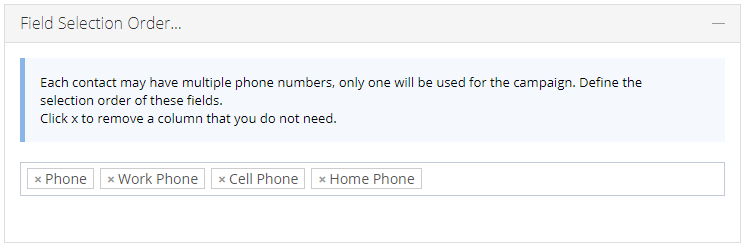 During the campaign preparation stage, the system tries to pick the first field in the defined selection order, if it is empty, it tries the second field and so on. Only one telephone number will be selected for a contact. If no phone number is available, the contact is counted as No Phone Number under the campaign summary. In addition, if the Do Not Call field is checked, the contact is skipped.