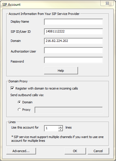 SIP trunk setups are usually much easier. In most cases, all you need to do is enter the SIP trunk server’s IP address in the domain field, and turn off domain registration.