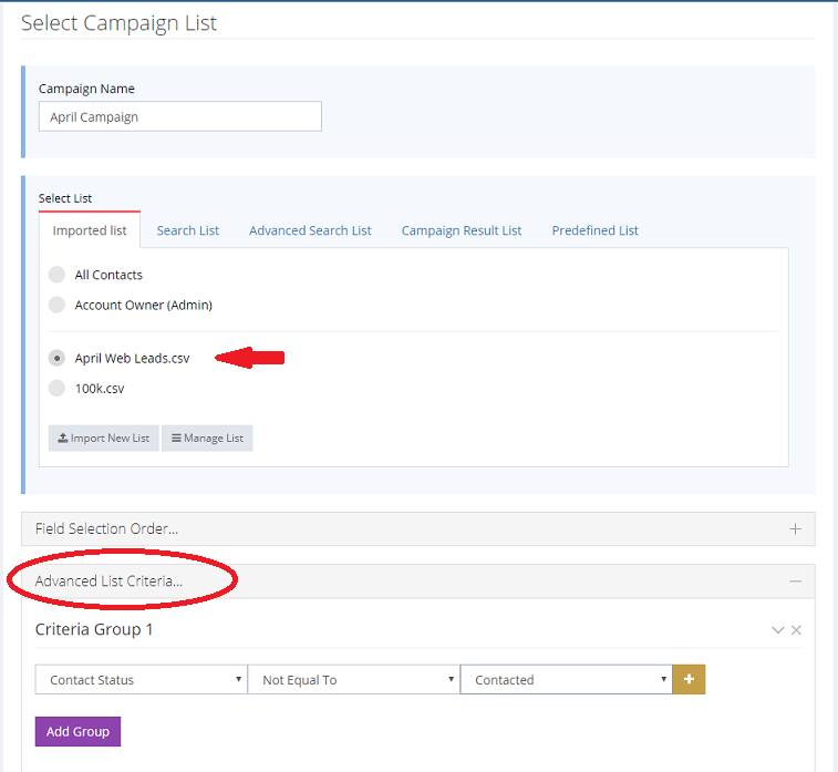Your campaign list is simply a collection of contacts that share some common features. For example, an imported list is a set of contacts with the same lead source. Assume you have an imported list named April Web Leads, below the advanced search defines a new list that excludes the people already contacted.