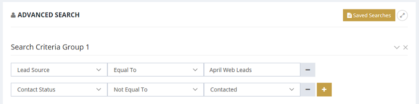 The above search criteria basically creates a dynamic list. For example, if your original April Web Leads contains 1000 contacts, and after a campaign, 200 of them are marked as Contacted, then the search result will find the rest 800 contacts that are not contacted. Save the search, for example, as "April Leads Not Contacted". (The advanced search can be found under the Tools or Action button of any contact page.)