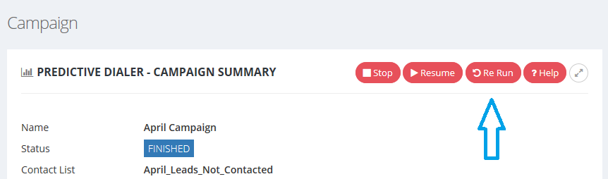 Since this campaign list is restricted to contacts with Contact Status set to Not Contacted, you can simply Run/Rerun the campaign as many times as you want. These campaigns will not call any contacts that are already contacted.