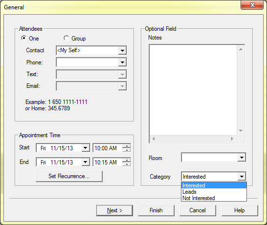 Click on to open a drop down menu. In this menu you will find the categories you have previous created. Select one to put this appointment into that category.