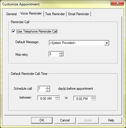 In the tab you can customize the default settings for phone reminders of appointments. If you check-mark the box then all newly created appointments will set a telephone reminder as the default. You can also set a , max amount of retries, and when the is.