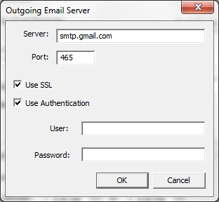 In the field enter the information for your chosen email service. In the image above we are using gmail. In the and fields enter the user name and password of the email service you intend to use as your outgoing email server, such as your gmail account.