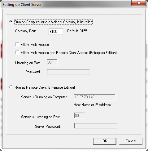 Here you can choose which computer (with Gateway installed) to connect to. By default, the top option (Run On Computer where Voicent Gateway is Installed) will be selected which means Auto Reminder will automatically connect to the local computer. You can choose to connect to a Remote Client if that client's Gateway has an Enterprise Edition license for Auto Reminder. You can simply enter the or of the computer you want to connect to. You will also have the option to allow or disallow web access for Auto Reminder.