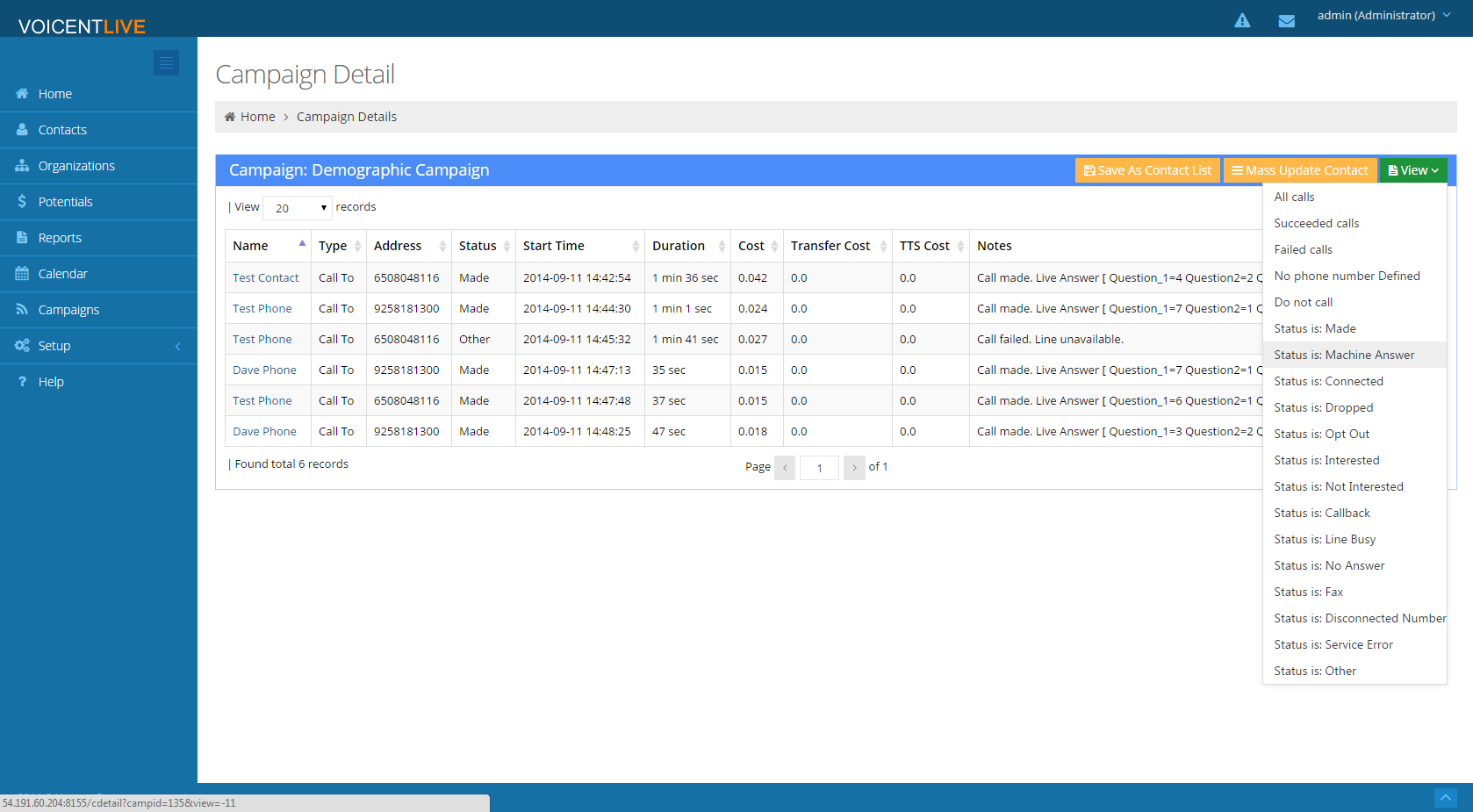 After running our filtering campaign, we may find ourselves wanting to run a follow-up campaign to try to catch contacts where an answering machine picked up or if a particular subset of responses indicated strong interest. By viewing the campaign details we can easily sort our list from the previously finished campaign and start a new campaign with a call list of just answering machine pick-ups or prospects who responded with strong interest.