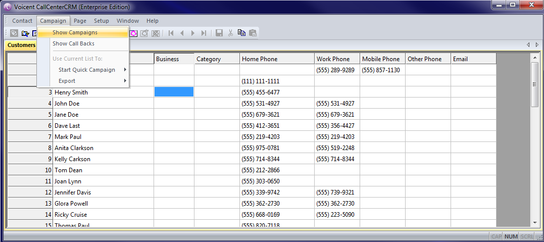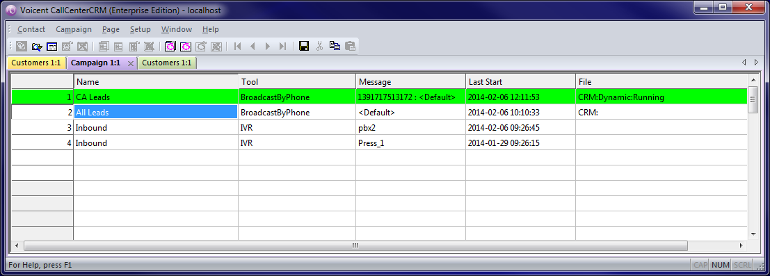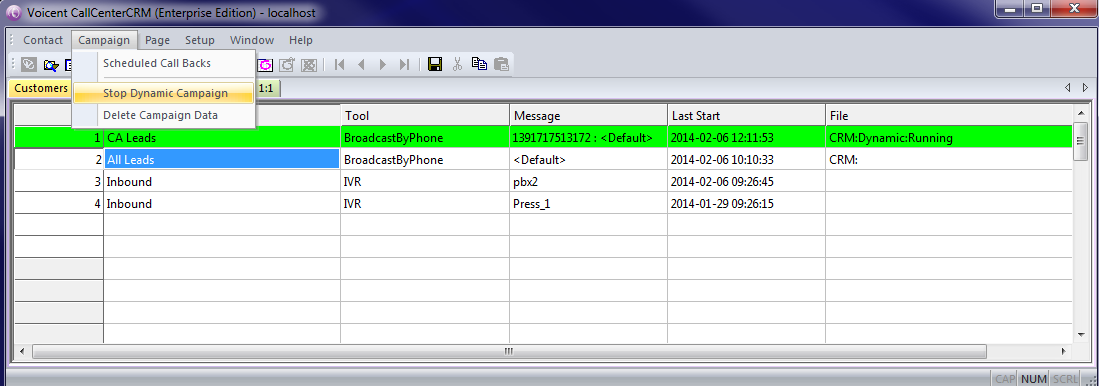 Once you have started one or more campaigns you will be able to monitor them through the Call Center CRM window. Select and click to bring up the following window: