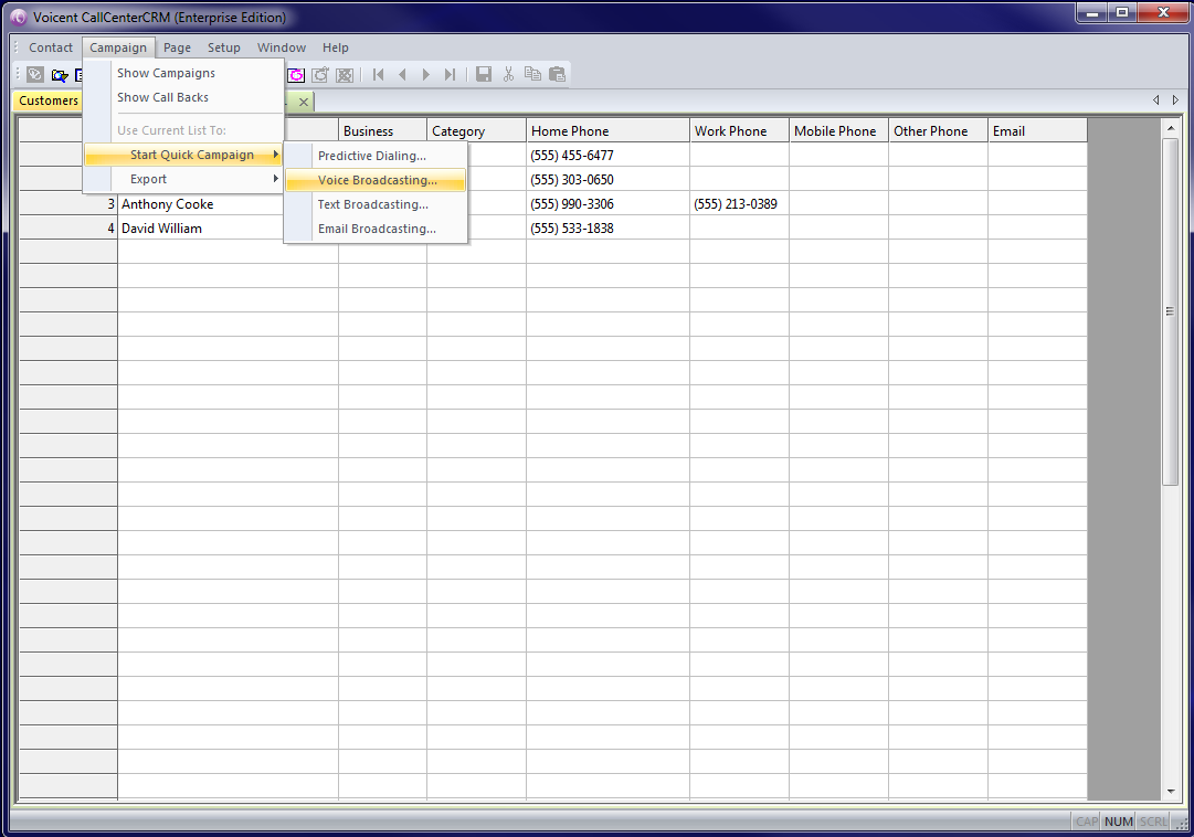 After you have the list of contacts ready in your CRM database, you can start a dynamic campaign. Go to in the toolbar then go to and select to start auto dialing your search results. You can also select or depending on which kind of broadcast you want to run. Please note, your ability to access certain features during broadcasting is dependent on your license for the type of broadcast you choose, not your license for Call Center CRM. For example, if you only have the professional version of Agent Dialer the option from Call Center CRM will only have the equivalent features to the professional edition of Agent Dialer. Also note that the shareware version of Call Center CRM will limit you to a maximum of ten records in your CRM database.