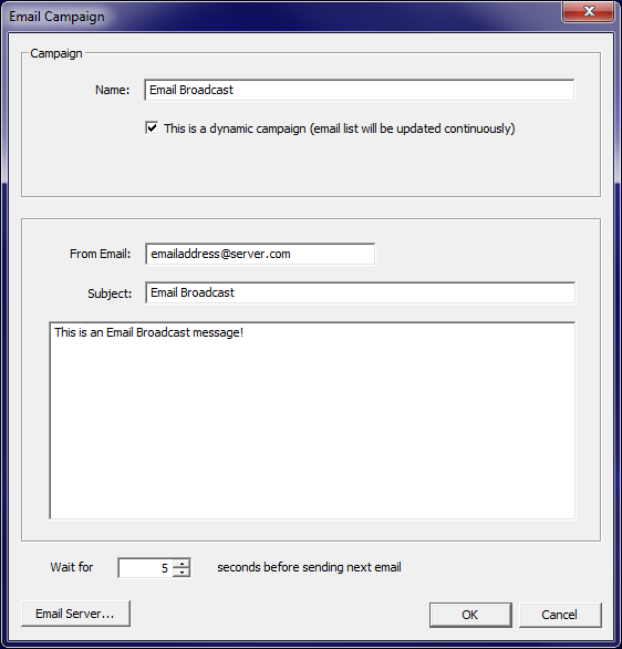 You will need to fill this out in order to send email broadcasts. Your information should resemble the image above depending on which email server you decide to use. For more information on how to set up your email server, click here.